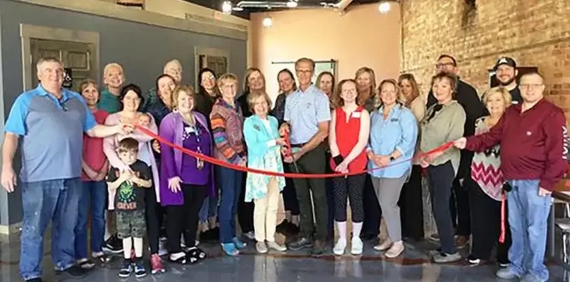 Pictured above are Laingsburg Mayor Jeff Geasler (far left) and LBCA officer Ed Tyler (far right) holding the ribbon. Then, L to R are Beth Lange, Jen West, Kayla Schaffer with her son Jack and baby Chloe, Molly Wiegel, John Liskey, Rhonda Rhine, Ashton Morris, Connie Hinton, Cheryl Sickles, (center with scissors) Lisa and Tom Jelenek, Christina Baynes, Gwen George, Hannah Sebenick, Julie Cooper, Heather Strieff, Leah Esch, Shawn Ragsdale, Justin Horvath, Gail Geasler and Roy Liskey.