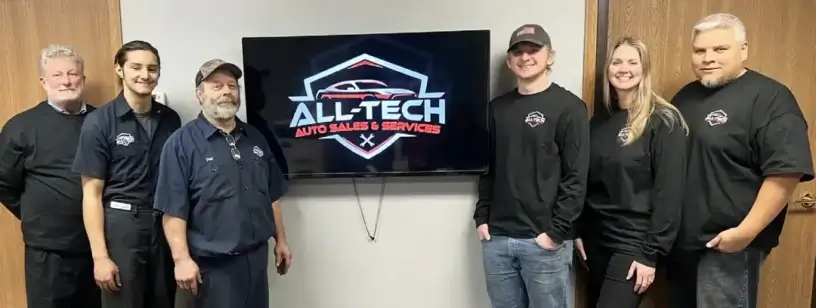All-Tech Auto Sales & Service staff: (L-R) Shop manager, Joe Hurley, Auto Tech, Tim Costello, Master Mechanic, Phil Sneed, Detailing & Car Porter, Tanner Scott, Owners, Stephanie & Jeremy Perez, Inserted: Office Manager, Dan Stroud